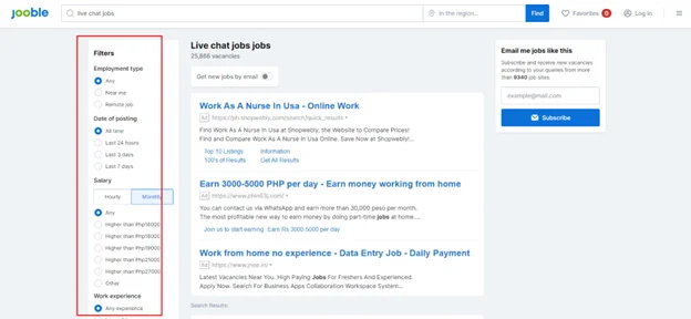 5. Once you've completed your profile, you can start searching for jobs by entering keywords, job titles, or company names in the search bar. You can also filter your search by Location, Date of Posting, Salary, Work experience, or Type of employment.